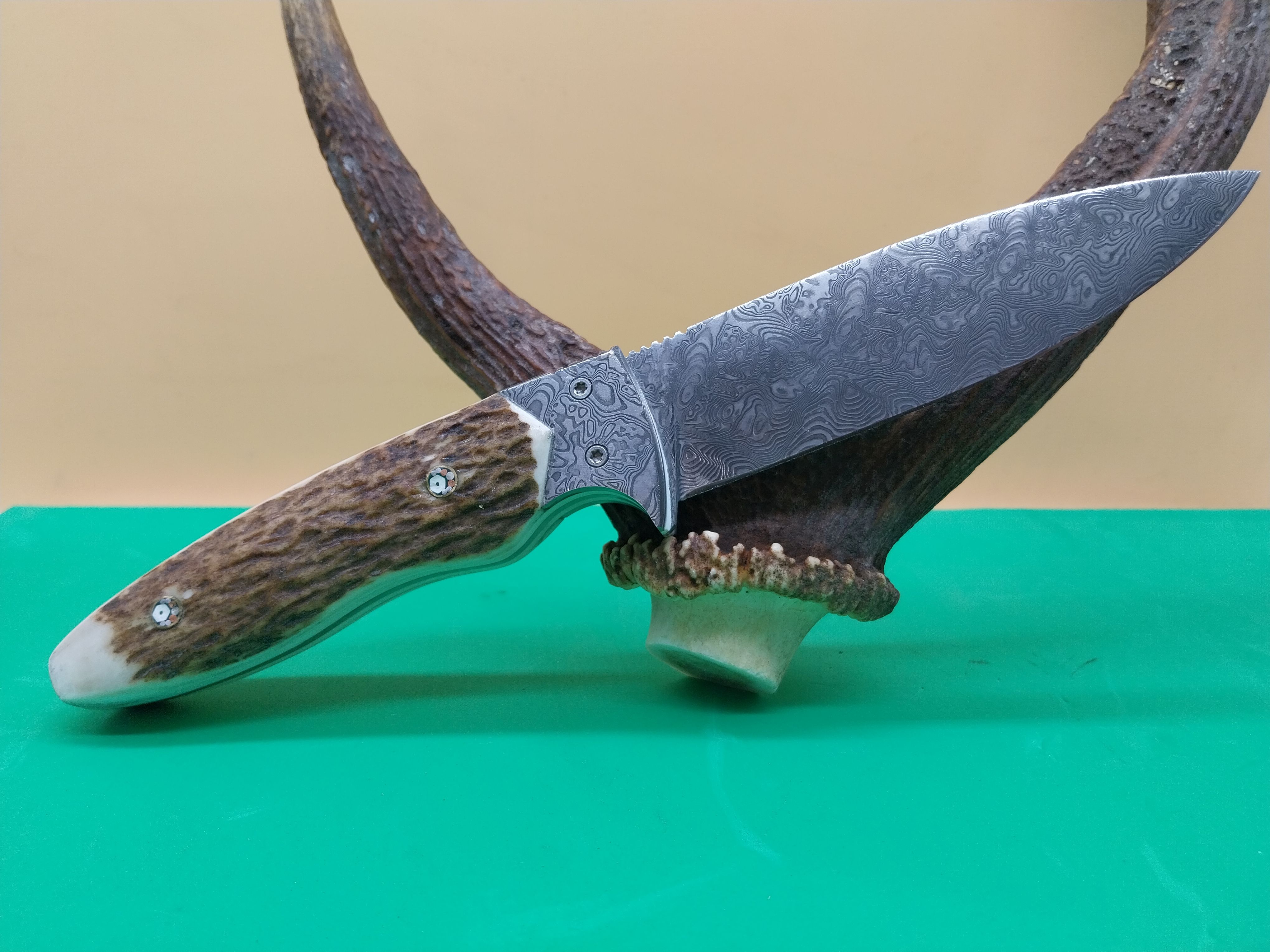 Aus dem vom Besitzer beigestellten Geweihstück, Backen ebenfalls aus Inox Blade Damast, weißen Elforyn Einlagen und selbst angefertigten Pins wurde der Griff gefertigt .